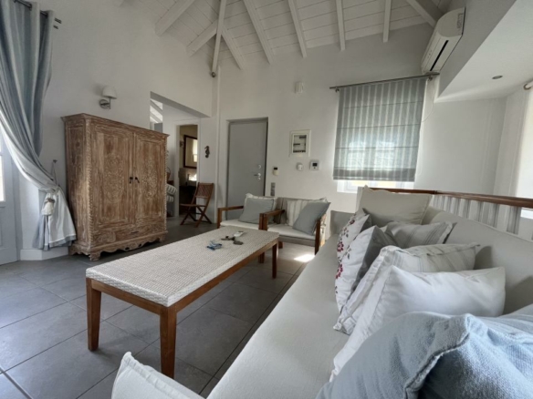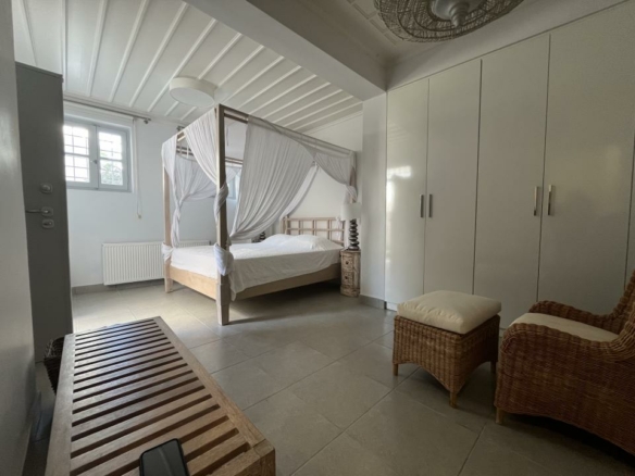 Στο υπερυψωμένο ισόγειο βρίσκονται 2 υπνοδωμάτια εκ των οποίων το ένα master με en-suite μπάνιο, ένα ακόμη μπάνιο και πολλές ντουλάπες. Και τα δύο υπνοδωμάτια έχουν μπαλκονόπορτες που βγάζουν σε μεγάλη σκεπαστή βεράντα με ανοιχτό ορίζοντα και θέα θάλασσα.