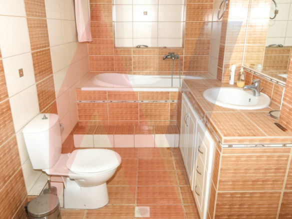 On the lower level, with an area of 91 m2, there is the house’s kitchen, a sitting room, a bedroom and a bathroom with a bathtub. From here there is access to the yard of the house, where there is the swimming pool, area 38 sq.m. a small storage room and a room where the pool cleaning and chlorination mechanism is located.