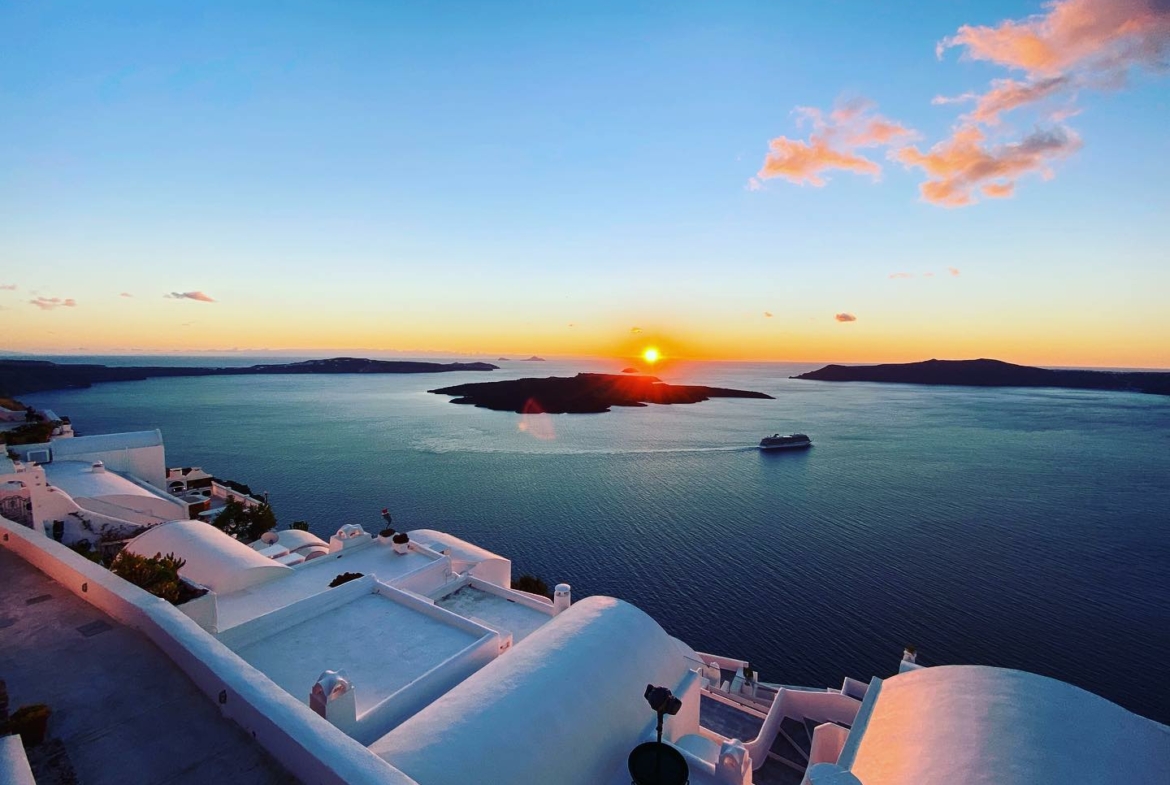 Santorini, ein Juwel in der Ägäis, besticht durch eine einzigartige Schönheit, die durch Vulkanausbrüche geformt wurde. Die Insel selbst hat die Form eines Halbmondes und umschließt eine Caldera, einen versunkenen Vulkankrater, der mit türkisfarbenem Wasser gefüllt ist. Dörfer klammern sich an Hunderte Meter hohe Klippen, ihre weiß getünchten Häuser mit blauen Kuppeldächern fallen die dramatischen Hänge hinab. Dieses ikonische Bild ist das, wofür Santorini am berühmtesten ist, denn es bietet von jeder Ecke aus atemberaubende Ausblicke auf die Ägäis.